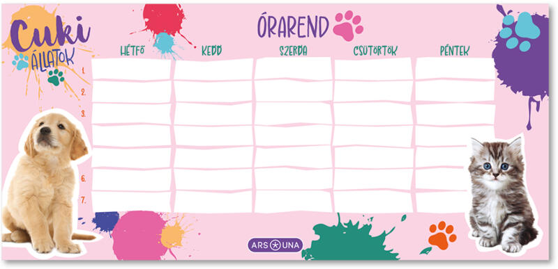 Ha gyermeked imádja a kiscicákat és kiskutyákat, akkor az Ars Una Cuki Állatok egylapos, kétoldalas órarend lesz a kedvence! A barátságos rózsaszín háttéren színes festékpöttyök és tappancsnyomok teszik még játékosabbá a megjelenést, miközben egy aranyos labrador kölyök és egy kíváncsi kis cica figyel a sarokból. Ez az órarend mosolyt csal minden kisállatbarát diák arcára, miközben segít rendszerezni a tanórákat.