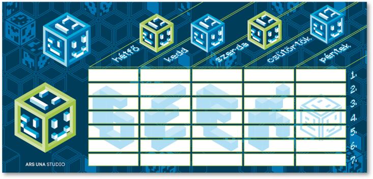 -Kétoldalas, magyar nyelvű órarend A és B hét beosztással-250 gr-os félfényes műnyomó papírra, 4 szín nyomással nyomott. -Méret: 232 x 109 mm