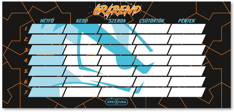 Ismerd meg az Ars Una Player One órarendjét, amely egy dinamikus és stílusos kiegészítő minden gamer diák számára. Ez az órarend fekete alapon narancssárga vonalas mintával van díszítve, így nemcsak praktikus, hanem vagány és modern megjelenést is biztosít, ami minden napodat feldobja.